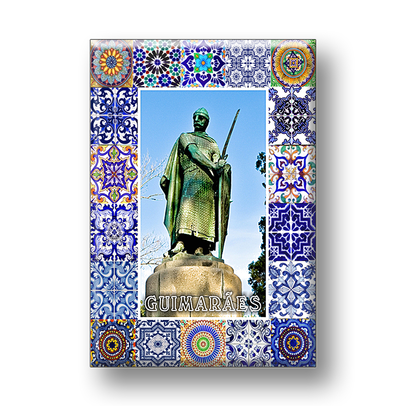 Imane para frigorifico com 53 x 79 mm, com imagem da estátua de D. Afonso Henriques, em Guimarães, cidade berço de Portugal e com uma moldura com vários azulejos.